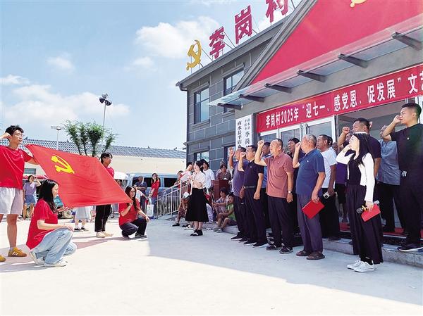 日前,黨員干部面向黨旗重溫入黨誓詞。商水縣平店鄉李崗村黨支部通過舉辦一場文藝匯演、共上一堂黨課、表彰一批優秀黨員、重溫一次入黨誓詞等活動,慶祝中國共產黨成立104周年。