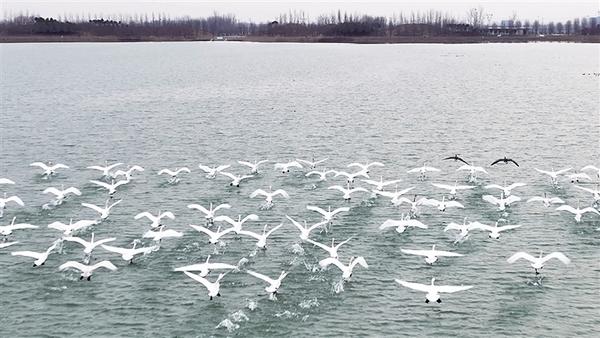近日,市城鄉一體化示范區引黃調蓄湖迎來一批北飛回遷的天鵝。這群天鵝或逐日飛翔,或踏水而歌,或悠閑覓食,盡情享受遷徙途中的休閑時光,吸引眾多群眾前來觀賞。