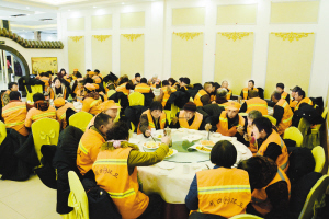本報訊 (記者 徐啟峰 通訊員 劉巍 文/圖) 2月17日,農歷臘月二十九上午,愛心人士韓平為川匯區環衛工人送去棉大衣,并邀請環衛工人共進午餐(如圖)。