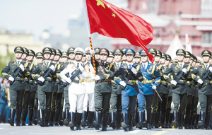 5月9日,在俄羅斯首都莫斯科紅場,中國人民解放軍三軍儀仗隊方陣行進在閱兵式上。俄羅斯9日在莫斯科舉行盛大慶典,紀念衛國戰爭勝利70周年。新華社發