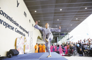 “中國角”首次現身歐盟開放日 5月9日,在比利時首都布魯塞爾歐盟委員會大樓下,中國武僧表演功夫。當日是歐盟一年一度的開放日。因今年恰逢中歐建交40周年,中國成為歐盟成員國外唯一一個開設宣傳角的國家,也是1993年歐盟舉辦開放日以來中國首次參加,為今年的開放日增添了不少中國元素。新華社發