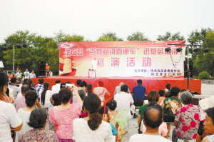 7月13日,沈丘縣“百姓宣講直通車”進基層宣講首場演出在該縣中華槐園千字文廣場舉行,舞蹈、戲曲、小品、大鼓書等多樣化的藝術形式,為前來游玩休閑的市民獻上了一道豐厚的精神大餐,讓大家在娛樂之余,對黨的新理論新政策有了更多的了解。圖為節目演出現場。(邵永成 攝)